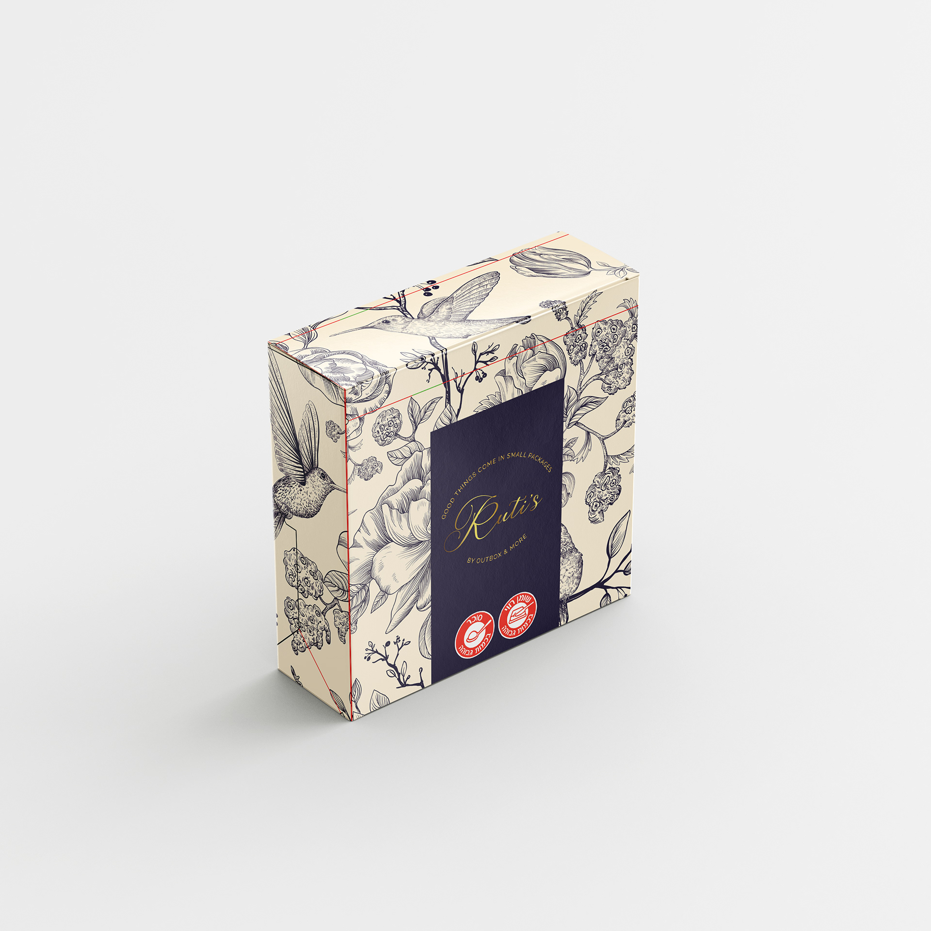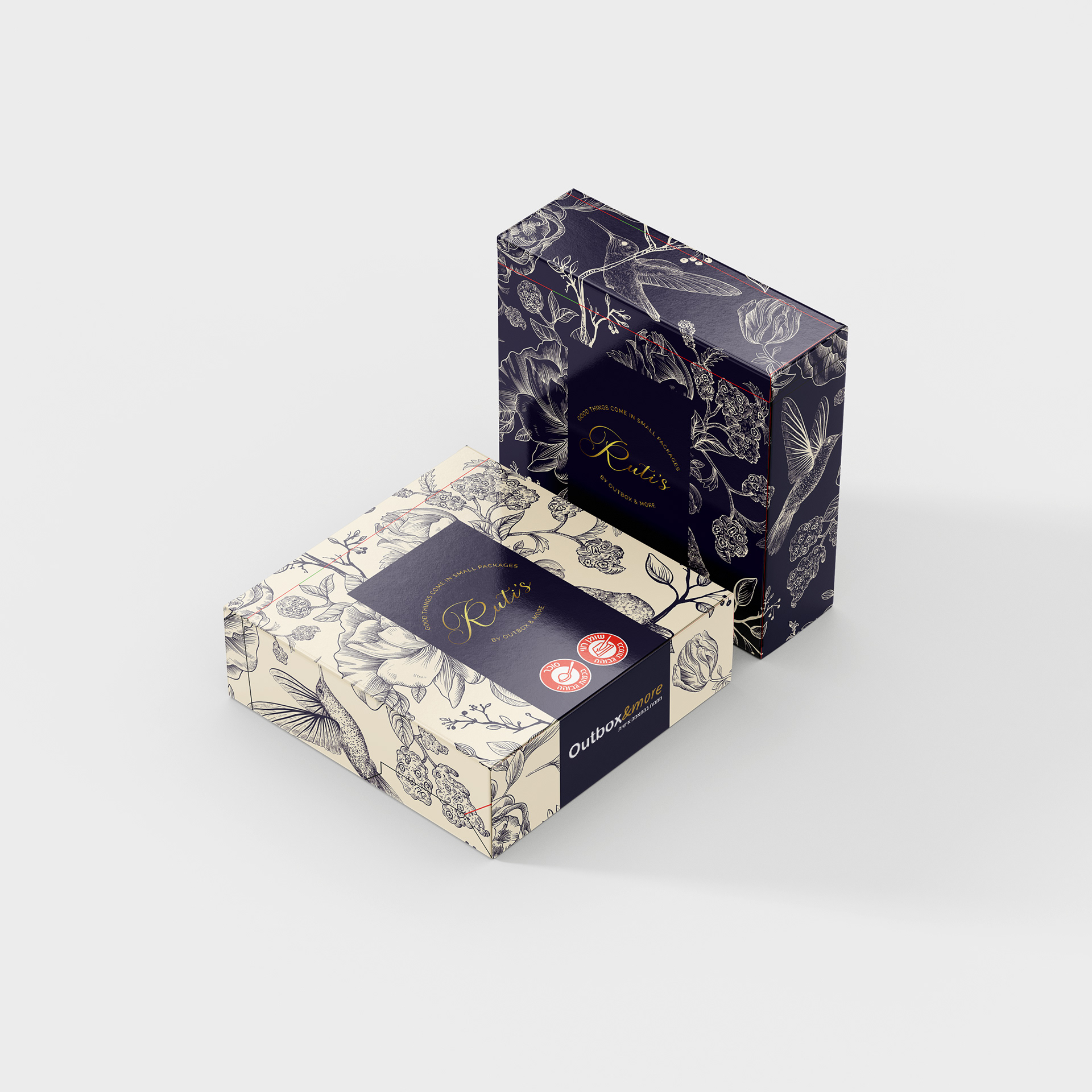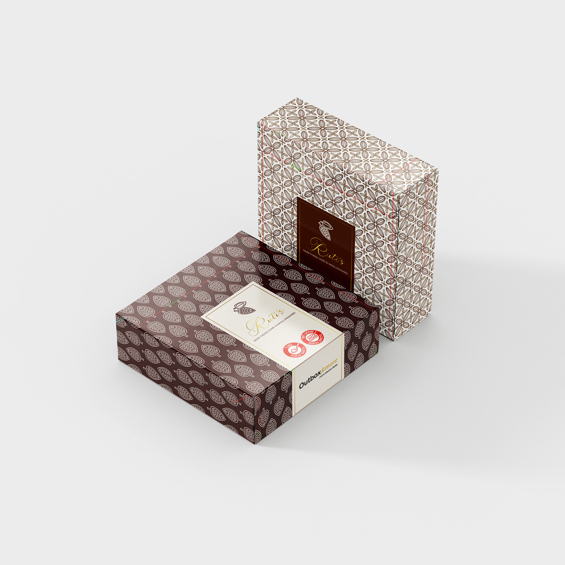 שני עיצובים למארז, שתי חוויות למותג אחד המותג רותי׳ס יכול להתלבש בצבעים שונים, כל אחד מהם מביא איתו רגש, טון ואווירה אחרת. העיצוב שלפניכם מציע שני כיוונים גרפיים שונים לעיצוב מארז השוקולד, כולם נבנו מתוך חיבור לערכים של המותג, אך כל אחד מדגיש ניואנס אחר